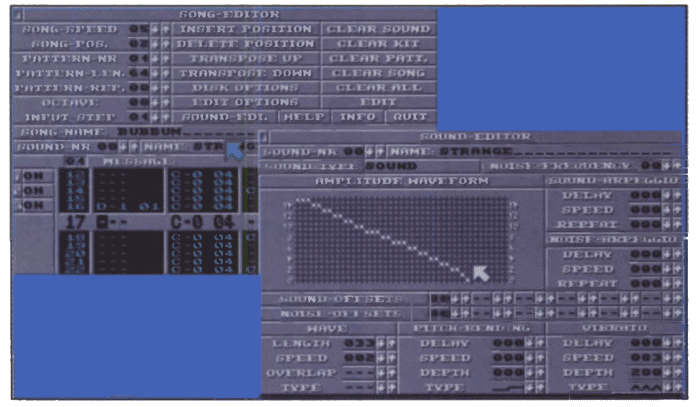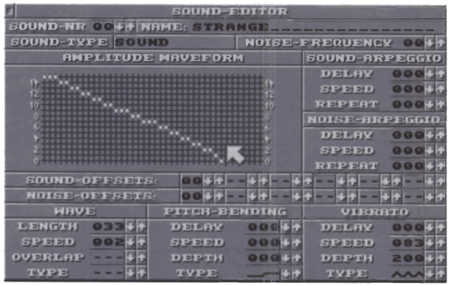 Im Sound-Editor, dem zweiten wichtigen Bildschirm von SOUND BUSTER, kann man alle Tonfunktionen, die der Soundchip und SOUND BUSTER bereitstellen, editieren. Mit der Hüllkurve in der linken Mitte des Bildschirms kann man den grundsätzlichen Lautstärke verlauf eines Sounds festlegen, der in einem Rasterfeld angezeigt wird. Die Hüllkurve kann mit der Maus verändert werden und wird beim Abspielen von links nach rechts durchlaufen. Die Maximallänge der Hüllkurve beträgt 40 Positionen und kann ebenfalls verändert werden. Außerdem läßt sich die Geschwindigkeit, mit der die Hüllkurve durchlaufen wird, bestimmen. Mit den Funktionen Ton-Arpeggio und Noise-Arpeggio ist es möglich, mehrere Töne bzw. Rausch-Klänge schnell hintereinander abzuspielen. Die Töne können im einzelnen festgelegt werden. Jeder eingegebene Wert wird als Offset zur eigentlichen Note in Halbtonschritten verstanden. Soll beispielsweise ein Dreiklang (z.B. C, E, G) gespielt werden, müssen die Offsets null, vier und sieben eingestellt werden. Mit der Funktion Pitch-Bending kann man die Tonfrequenz verändern. Einstellen lassen sich die Verzögerung, die Geschwindigkeit und die Stärke, mit der ein Ton verbogen wird. Ferner kann festgelegt werden, in welche Richtung die Frequenz verbogen wird. Last but not least bietet SOUND BUSTER ein Vibrato an, mit dem die Tonfrequenz moduliert werden kann. Hier lassen sich ebenfalls die Verzögerung, die Geschwindigkeit und die Stärke des Vibratos einstellen. Ferner kann man die Art des Vibratos (Sinus- oder Sägezahnschwingung) festlegen.