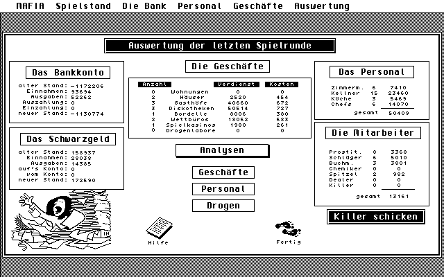 MAFIA - THE GAME ist rein spieltechnisch eine Simulation, in der gewisse Parameter pro Spielzug verĂ€ndert werden mĂŒssen. FĂŒr GaststĂ€tten mĂŒssen ZimmermĂ€dchen und Köche beim Arbeitsamt angefordert werden und fĂŒr Diskotheken Kellner und GeschĂ€ftsfĂŒhrer. Bei der Einrichtung eines Drogenlabors mĂŒssen Chemiker und Dealer angeheuert werden. HĂ€user und Wohnungen können aber auch völlig legal vermietet und verpachtet werden. Ziel ist es einfach, genug Geld zusammenzubekommen, um SchlĂ€ger und Spitzel auf die anderen Dons zu hetzen. Hat man sich erst mal eingespielt, verrinnen die Stunden recht schnell. Eingestreut sind auch Nachrichten und Aktionen, auf die manchmal reagiert werden muĂ. So kann der Fremde, der von einem die Zwischenlagerung von 400 Gramm Plutonium erbittet, vom BKA beobachtet werden. Wird man beim Deal erwischt, wandert man halt fĂŒr zwei Jahre in den Bau. Zeit, die den ComputerDons Vorsprung gibt. Das Spiel ist nicht fĂŒr mehrere Spieler ausgelegt und lĂ€uft auf jedem Rechner in der ST-Hoch-Auflösung. Die PD-Version ist auf fĂŒnf Spieljahre begrenzt (60 Spielrunden). Wer das Handbuch fĂŒr 30 DM kauft, kann den Code eingeben und unbegrenzt spielen.