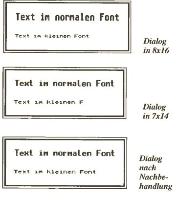 Noch etwas schwieriger wird es, wenn das Programm eigene Dialogroutinen benutzt und daher ermitteln muß, welchen Font das AES in Dialogen verwendet (graf_handle liefert ja bekanntlich nur die Größe der Zeichenzelle zurück). Neue AES-Versionen (seit 4.00) kennen eine Funktion, über die man diese Werte erfragen kann. Bei älteren AES-Versionen (MagiC 2.x oder ATARI-AES mit einem der dazu gebräuchlichen Autoordner-Patches) hingegen muß man sich mit einem etwas häßlichen Hack begnügen.