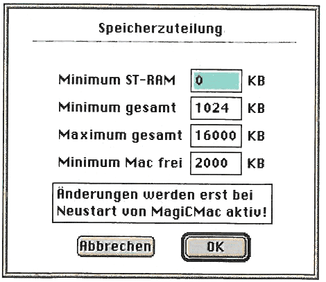 Beim Arbeitsspeicher können 8 MB als normale Ausstattung betrachtet werden. Bei Macs mit nur 4 MB verbleiben nach dem Start von MagiCMac lediglich 1,5-1,9 MB für ATARI-Programme, da allein das MacOS abhängig von den installierten Erweiterungen 1,5-2 MB belegt.