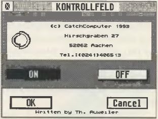 Wenn der TT wieder zusammengebaut ist, muĂ nur noch die Software-Installation vorgenommen werden. Catch-Computer liefert eine Diskette mit, auf der sich ein CPX-Modul namens POWER-UP2.CPX befindet. Es kann mit dem Kontrollfeld XCONTROL.ACC von ATARI betrieben werden und verzichtet, verglichen mit dem Dashboard des CaTTamaran, wohltuend auf jeglichen grafischen Schnickschnack. Es gibt nur vier Knöpfe: âON", âOFF", âCANCEL" und âOKâ (Auf die deutsche Sprache wurde also auch verzichtet). Beim Klick auf âOKâ wird die Schalterstellung automatisch abgespeichert. Wer auf den Betrieb des CPX-Moduls verzichten möchte, kann wie beim CaTTamaran auf zwei Kleinstprogrammev zum Umschalten des Systemtaktes zurĂŒckgreifen.