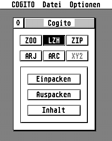 Unterstützt werden die Packer ZOO, LZH, ZIP, ARJ und ARC. Um die Packerpfade einzustellen, muß man einen Editor haben und sich die INF-Datei einladen. Dort sind die Pfade samt den Parametern als ASCII-Text aufgeführt. Cogito bietet keine Automatikfunktion und ist auch sonst eher spärlich. Jedoch ist die Bedienung "ultraeinfach". Man kann einfach per "Drag and Drop" eine gepackte Datei auf Cogito ziehen, und das Programm fragt alle nötigen Parameter beim Anwender nach. Dies ist sehr nützlich, wenn z.B. die Packerpfade nocht nicht richtig angegeben sein sollten. Alles in allem ist Cogito besonders für den Alltag sehr gut zu gebrauchen und daher äußerst empfehlenswert.