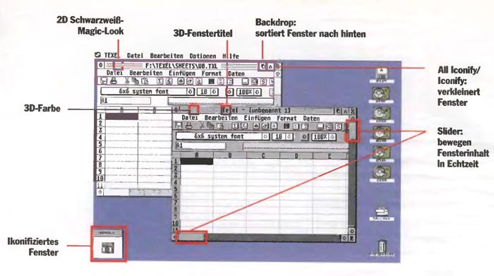 Beschäftigen wir uns aber noch ein wenig mit den Fenstern. Einer der Vorzüge von MagiC! war und ist die Möglichkeit, die Fenster einer Applikation auszublenden, um auf dem Bildschirm wieder für Überblick zu soigen. In die gleiche Richtung zielt die Unterstützung des „Iconify" bei Fenstern. Gibt ein Programm beim Öffnen von Fenstern an, daß diese Funktionalität unterstützt wird, erscheint im oberen Fensterrand ein kleines Dreieck. Ein simpler Klick auf genanntes Symbol läßt das Fenster schrumpfen und am unteren Bildschirmrand erscheinen. Ein Doppelklick in den Innenbereich des kleinen Fensters bringt es wieder zurück in die alte Form und an den vorherigen Platz. Möchte man nun alle Fenster eines Programmes auf einmal iconisieren, kann man zusätzlich zum Klick auf das Symbol eines (beliebigen) Fensters der Anwendung die Control-Taste drücken. Dadurch werden alle vorhandenen Fenster in ein einziges Minifenster zusammengefaßt. Das betrifft auch die Fenstereines Programmes, die schon iconifiziert waren.