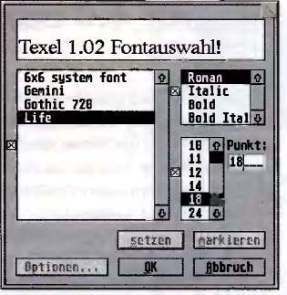 Verursacht durch NVDI und Speedo GDOS, hat auf dem ATARI auch eine Vielzahl an Schriften Einzug gehalten, die von den Programmen genutzt werden wollen. Bislang waren die Programme darauf angewiesen, eine Schriftauswahl selber anzubieten, was zu vielen unterschiedlichen Ansätzen führte (internen und externen). Damit allen Anwendungen eine einheitliche Schnittstelle zur Verfügung steht, hat MagiC! einen neuen Systemaufruf implementiert, der obigen Font-Selektor auf den Schirm bringt. Bislang unterstützen allerdings erst wenige Applikationen die Zeichensatzauswahl, was sich wohl aber mit zunehmender Verbreitung von MagiC ändern sollte.