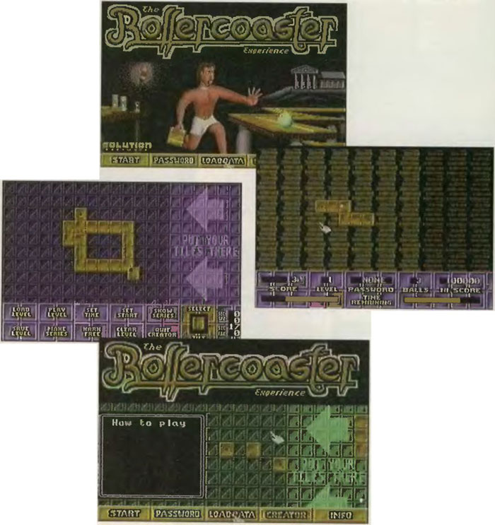 Mit einer Anzahl vorgegebener Bauteile mĂŒssen Sie die frei auf dem Spielfeld plazierten Anfangs- und Endkacheln verbinden. Hierbei stehen dem Spieler Kreuzungen, Kurven und VerlĂ€ngerungen zur VerfĂŒgung. Gegen ein Zeitlimit gilt es, alle Kacheln zu verbauen. Es darf keine Sackgassen oder offene Enden geben. Ist die zweidimensionale Achterbahn fertig (oder die Zeit abgelaufen), rollt eine kleine Kugel gemĂ€chlich (es bleibt also noch ein wenig Zeit, um letzte Ănderungen an der Bahn vorzunehmen) zum Ziel, und das Level ist geschafft. Klingt einfach, stellt sich aber bald als ziemlich knifflige Angelegenheit heraus. Denn einen netten Weg zu bauen ist meist nicht schwer, nur daĂ man dann ein paar Steine ĂŒbrig behĂ€lt, entsetzt auf die Zeitanzeige schielt und sich hektisch in Umbauarbeiten stĂŒrzt. Nach jedem 10. Level gibt es ein PaĂwort, und wer alle 100 Levels durchspielt hat, kann sich oder andere mit dem eingebauten Level-Editor und eigenen abspeicherbaren Kreationen weiter beschĂ€ftigen. Leider fehlt eine Pause-Funktion im Spiel, wenn also an der WohnungstĂŒr geklingelt wird, steht man vor der Wahl, das Spiel zu verlieren oder einen Besucher. Auch hĂ€tten weitere Kacheln mit Sonderfunktionen etwas mehr WĂŒrze ins Spiel gebracht. Die Hintergrundgrafik Ă€ndert sich stĂ€ndig, die Kacheln bleiben immer gleich. Insgesamt hĂ€lt sich die Grafik selbst fĂŒr ST-VerhĂ€ltnisse auf durchschnittlichem Niveau. Es wurde zwar auch an S/W-Monitorbesitzer gedacht, aber hier sieht man sich lediglich der konvertierten Farbgrafik gegenĂŒber.
