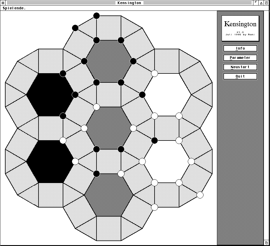 Kensington ist eine Umsetzung eines Brettspieles auf den Computer. Es erfüllt alle GEM-Standards und ist somit auf jedem TOS-kompatiblen System und unter jeder Auflösung lauffähig. Die Spielfeldgröße kann jederzeit durch Ändern der Fenstergröße variiert werden. Das Spiel ist für 2 bis 6 Spieler.