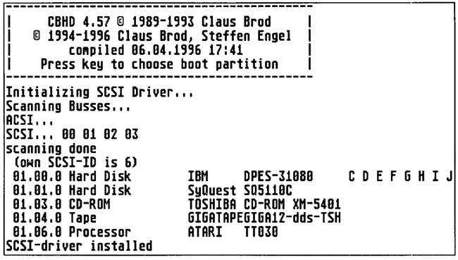 Eine wesentliche Funktion des CBHD ist der integrierte SCSI-Treiber. Schon immer fehlte dem Betriebssystem des ATARI ein Teil, um die GerĂ€te anzusprechen. Abgesehen davon, daĂ jeder Programmierer, der die SCSI-GerĂ€te ansprechen will, eigene Libraries schreiben muĂte, ergeben sich daraus auch Kollisionsprobleme. Bei Multitasking-Systemen ergibt sich sehr leicht das Problem, daĂ bei mehreren Programmen, die alle ihre eigenen SCSI-Routinen besitzen, Kollisionen der Programme auftreten. Daher sollte grundsĂ€tzlich eine Schnittstelle immer nur von einem Treiber bedient werden, was nicht nur fĂŒr die SCSI-Schnittstelle gilt, sondern grundsĂ€tzlich fĂŒr jede Schnittstelle. Im Prinzip entspricht dies genau der Problematik, die sich auch bei unsauberen Programmen ergibt, die direkt in den Bildschirmspeicher schreiben und nicht ĂŒber das VDI gehen.