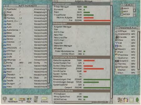 Am unteren Bildschirmrand zeigen sich die Symbolleiste mit den aktiven, geladenen Programmen (es sind so viele Programme startbar, bis der Arbeitsspeicher „kracht“), den Laufwerkssymbolen für Harddisks, CD-ROM, Floppy etc. und dann noch das Monitorsymbol sowie das Acorn-Logo. Hinter dem Acorn-Logo befindet sich z.B. der Aufgaben-Manager. Mit einem Klick auf das Monitorsymbol lassen sich in einem Fenster alle Bildschirmeinstellungen, wie Auflösung und Farbtiefe verändern - und das, ohne den Rechner neu starten zu müssen - MacOS läßt grüßen!