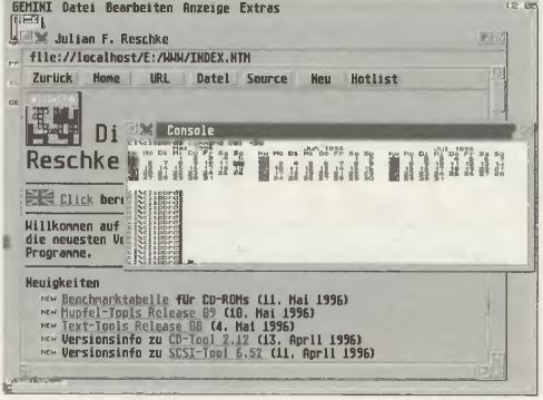 „XaAES“ von einer Gruppe um Craig Graham ist in einer frühen Betatest-Phase. Interessant sind nicht nur die ausgefallene Optik (siehe Abbildung 2), sondern auch die Interna: so kommunizieren die „Clients“ mit dem AES-Kernel über Pipes (ganz wie bei X .11). Bestehende GEM-Applikationen werden dabei durch TRAP-2-kompatible Routinen unterstützt. Trotz einiger Redraw-Probleme konnte man im Beta-Release 5 schon mit allerlei Programmen arbeiten.