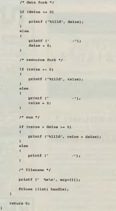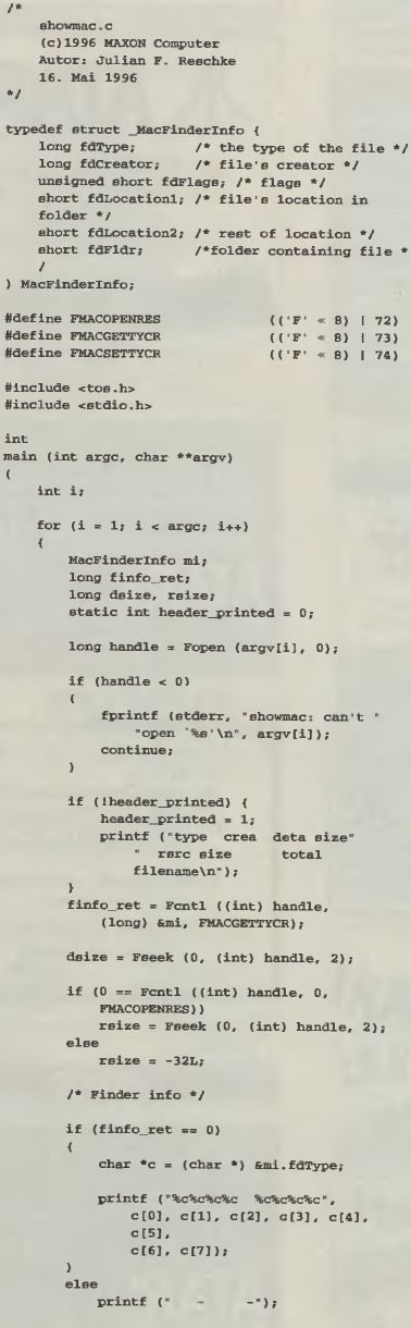 Glücklicherweise waren die Autoren von MagiCMac ebenfalls der Meinung, daß dies eine nützliche Einrichtung sei, und so bietet MagiCMac ab Version 1.3 genau die gleichen Funktionen an. In Listing 1 sehen Sie den Quelltext für das Einfach-Programm „showmac.ttp“, das Type, Creator sowie die Größen der beiden Forks anzeigt. Die Beispielausgabe in Abbildung 4 zeigt sehr schön, daß bei Mac-68K-Applikationen der wichtige Teil in der Resource-Fork steht und daß bei vielen anderen Dokumenten, wie zum Beispiel Framemaker-Texten oder Stuf-fit-Archiven, die Resource-Fork leer ist.