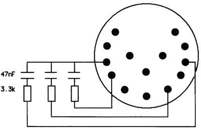 Die Floppy-Schnittstelle kann nur bei den Rechnern 520ST, 520ST+ und 260ST getestet werden, da hier keine Treiberbausteine bei den Select-Leitungen Verwendung finden und keine Floppy eingebaut ist. Getestet werden nur die Select-Leitungen Drive Select 0 und 1 sowie Side Select! Diese sind auch am kritischsten, da der Soundchip, der diese Leitungen bedient, durch Überlastung leicht zu beschädigen ist, was passieren kann, wenn Pull-Up-Widerstände von deutlich weniger als 3.3 kOhm angeschlossen werden. Die Funktionsweise dieses Tests unterscheidet sich etwas von den bisherigen. Es wird die Tatsache ausgenutzt, daß die Ports des Soundchips sowohl als Ausgang - das ist die normale Einstellung - als auch als Eingang benutzt werden können. Der Prüfstecker (Abb. 4), für den Sie einen ATARI-Floppy-Stecker benötigen, enthält Kondensatoren (47nF), die über Widerstände (3.3k) von den als Ausgang geschalteten Port-Leitungen auf High-bzw. Low-Pegel geladen werden. Sofort nach dem Laden werden die Soundchip-Ports auf Eingang geschaltet und überprüft, ob der Sollpegel vorliegt. Bei defekten Leitungen ist dies nicht der Fall.