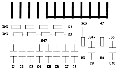 R1, R2 Widerstandsnetzwerk, Typ Vitrohm L-3/B, 4 Widerstände (8pol.), 3.3k oder jeweils vier einzelne Widerstände 1/10 Watt (s. Text)