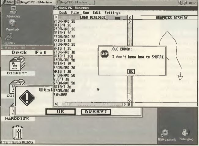 In der Abb.l ist zu sehen, wie wir uns ein kleines Späßchen erlaubt haben. Wir haben MagiC-PC zweimal installiert und gestartet. Links unten ist ein Fenster, in dem ein schwedisches TOS 1.00 in 320x200 läuft (leicht am Papperskorg und am „Avbryt“-Knopf zu erkennen). Rechts oben läuft ein deutsches Disketten-TOS, das über „Einlesen" aktiviert wurde. In den Laufwerkscontainer C: hatten wir vorher den Inhalt der Original-Language-Disk kopiert, auf der ja mal Abenteuer-BA-SlCund LOGO zu finden waren. Unsere Logo-Kenntnisse sind leider ein wenig eingerostet, aber man kann sehen, daß wir die „Turtle“ doch ein wenig bewegen konnten.