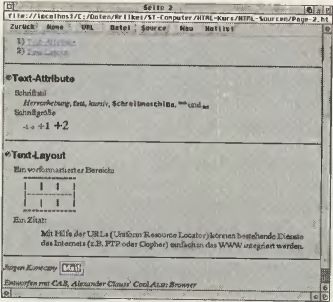 Die Grundlage des Word Wide Web bilden Dokumente im HTML-Format,die auf den WWW-Servern bereitliegen und von den Internet-Teilnehmern mittels geeigneter Browser abrufbar sind. Seit geraumer Zeit gibt es nun auch für den ATARI einen WWW-Browser - CAB - der die Dokumentenbeschreibungssprache HTML beherrscht. Damit eröffnet sich für den Anwender eine neue Art von Dokumenten.