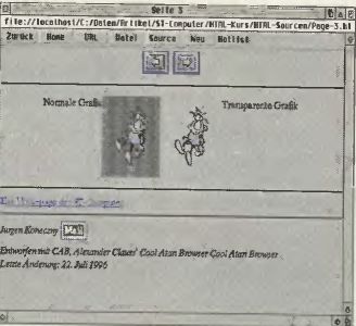 Als nächstes werden zwei - nahezu identische - Bilder in das Dokument eingebunden. Sieht man sich die Darstellung des HTML-Dokuments (Abbildung 3) an, erkennt man deutlich, daß das erste rechteckig umrahmt ist, während das zweite scheinbar vor dem Hintergrund schwebt. Das spezielle Format GlF89a ermöglicht dieses Verhalten, indem es eine Farbe aus der Farbtabelle als transparent markiert. Der Browser läßt diese Farbe dann aus. Statt ihrer scheinen Hintergrundfarbe oder -bild durch die GIF-Grafik hindurch. Um aus einem herkömmlichen GIF87-Bild ein GIF89a-Bild zu erstellen, liegt CAB das kleine Utility TRANSGIF bei, das eine Farbe aus der Farbpalette des Originals als transparent markiert. Normalerweise müssen Grafiken von Anfang an auf diesen Zweck hin konzipiert sein, da die Farbe, die als transparent markiert werden soll, nicht im Motiv selbst Vorkommen darf.
