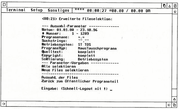 Doch kommen wir zurück zu den Funktionen der Mailbox. Im öffentlichen Programmteil findet man Freeware, Shareware und Demosoftware für alle möglichen Systeme. Zu jedem File sind diverse Informationen gespeichert, mit deren Hilfe man gezielt nach bestimmter Software suchen kann, also z.B. nach einem »Maus-Tausch-Programm« für das Betriebssystem »ST-TOS« (Bild 2). Schaltet man dann noch die Option »Taggen« ein, so kann man mit einer Art Fileselektor aus allen Files, auf welche die Suchkriterien passen, diejenigen auswählen, die man downloaden möchte. Spezielle Unterverzeichnisse, wie man sie aus anderen Mailboxen kennt, gibt es im Programmteil nur in Ausnahmefällen. Meistens handelt es sich um Files, die nur für Leser bestimmter Gruppen interessant sind, weshalb sie auch als Gruppenprogrammteile bezeichnet werden. Wichtig für Neueinsteiger ist, daß in vielen MausNet-Mailboxen die MausTausch-Programme in einem Gruppenprogrammteil MAUSTAUSCH zusammen gefaßt sind.