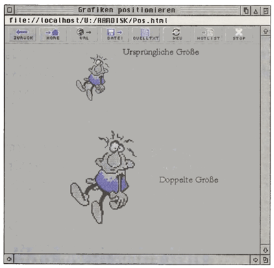 Für Grafiken sieht HTML noch zusätzliche Möglichkeiten der Positionierung innerhalb des Tags <IMG> vor. So läßt sich die Größe einer Grafik mit den beiden Parametern "WIDTH" und "HEIGHT" in Pixel vorgeben. "WIDTH" legt die Breite und "HEIGHT" die Höhe des Bildes fest. Für die Darstellung skaliert der Browser die Grafik auf die vorgegebene Größe. Mit dem Parameter "ALIGN" wird die Position der Grafik gegenüber dem umgebenden Text festgelegt. Mögliche Optionen sind "TOP", "MIDDLE" und "BOTTOM". "TOP" positioniert den Text an der Oberkante, "BOTTOM" an der Unterkante und "MIDDLE" schließlich in der Mitte der Grafik. Mit der Kombination der Parameter läßt sich eine Grafik relativ frei innerhalb des Textes positionieren.