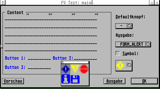 Im FV-Programm kann (fast) jeder Dialog getestet werden. Dadurch erkennt man schon vorher, ob alle Resource-Flags richtig gesetzt wurden. Wünschenswert wäre nur noch das FV den Namen des Objektes anzeigt, das betätigt wird.