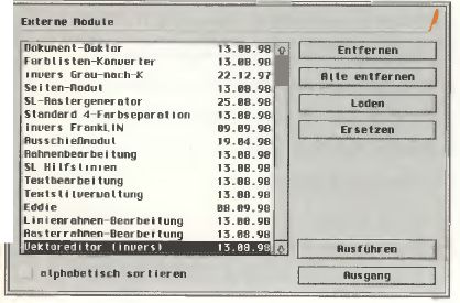 Greifen wir nochmals auf die Liste aus der 1. Folge (ST-Computer 11/1998) zurück, nehmen aber diesmal nur die „Abteilungen“, die Calamus im Standardlieferumfang schon mitbringt. Es ist nicht nötig, wirklich sämtliche Module ständig geladen zu haben! Hier ein sinnvoller Vorschlag (mit Begründungen) für eine grundsätzliche Ladereihenfolge: