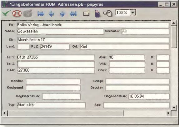 Diese Eingabeformulare sind für jede Datenbank völlig frei zu gestalten. Eine Besonderheit ist, daß in papyrus BASE die von papyrus WORD her bekannten diskontinuierlichen Blockoperationen möglich sind, dazu kann man auch Blöcke wie bisher mit der Maus verschieben.