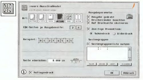 Ausschieß-Modul: Die Vollversion des Ausschießmoduls unterstützt verschiedenste Ausschießschemen bis hin zu völlig frei gestaltbaren Schemen. Durch den Ausgabeparameter-Schalter „Auf Druckseite skalieren" lassen sich z. B. ohne Mühe A4-Briefbogen-Entwürfe einschließlich Passermarken auf A4-Blättern ausdrucken. Die Schalter für 2seitige Produktion sind für Auflagen oder Kopien beidseitig bedruckter Dokumente im Eigendruck sehr praktisch. Nebenbei: Mit dem Mac-Universaldrucker MacPrint können Duplex-Drucker am Mac direkt beidseitig „füttern".