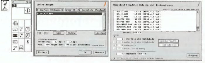 Wie sieht denn der „Workflow“ eines solchen Dokuments in der Praxis aus? Der Feindaten-Manager kümmert sich automatisch um die Zuordnung der vielen einzelnen, auf Festplatte ausgelagerten Bilder. Tiff-Bilder überläßt er dabei am liebsten gleich Tiffie, dem genialen Tiff-Import/Export-Treiber. (Ja, richtig gelesen, Tiffi heißt jetzt Tiffie und kann eben auch gepackte TIFFs exportieren.)