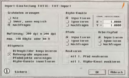 Der Importer Tiffi heißt jetzt Tiffie und kann endlich auch gepackte TIFFs exportieren. Der Einstelldialog für Tiffies Import-Parameter wird geöffnet, indem man im Importtreiber-Dialog Tiffie selektiert und beim Klick auf den „Importie-ren"-Button die Control-Taste (Strg) gedrückt hält. Es gibt wirklich eine Menge interessanter Features einzustellen. Beim Export gibt es nichts einzustellen; die TIFF-Daten werden einfach gepackt exportiert.