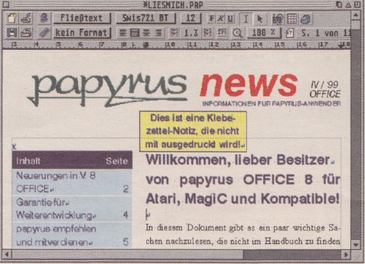 Insgesamt hat man so auch auf dem Atari ein Arbeitswerkzeug, von dessen Stabilität, einfacher Bedienung und Schnelligkeit PC-Besitzer mit MS-Word nur schmachtend träumen können. Auf der Atari-Herbstmesse waren eindrucksvolle Beispiel-Dokumente zu sehen; so ein "Nachbau" einer aufwendigen Zeitungsseite aus den "Leverkusener Stadtnachrichten", ein paar Speisekarten oder auch die komplette Bibel, ein 6 MB großes Dokument mit 1.600 Seiten, das papyrus "einfach so" auf einem TT in 30 Sekunden einlas und in dem man normal arbeiten konnte, gespickt mit vielen Fußnoten etc. MS Word stürzt hier im Vergleich beim Einlesen einfach nur ab; und die Schwierigkeiten von MS Word mit Fußnoten sind ja bereits legendär.