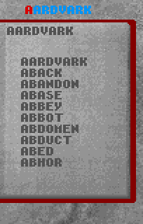 Jeder der Scrabble kennt oder schon mal gespielt hat, wird sicherlich wissen, das es so manchen Streit um gelegte Wortkombinationen gibt. Die deutsche Sprache wird schonmal um interessante Wörter ergänzt, bloß um das ungeliebte "X" und "Y" zu verbauen. Doch während beim Brettspiel das Wörterbuch noch schlichten kann, ist dies beim Lynx schlecht möglich. Lexis hat deswegen ein eingebautes Wörterbuch, das sich bei einigen Stichproben als sehr umfangreich erwiesen hat. Beim Spielen wird man eher die Erfahrung machen, das Lexis zu viele statt zu wenige Wörter kennt. Das Wörterbuch läßt sich auch einsehen, so das man sich auch selber eine Aufgabe stellen kann, z.B. das Wort "Aardvark" zu bilden.