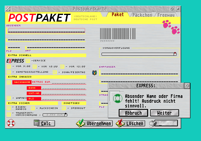 Sehr hilfreich ist, dass Express vor dem Ausdruck noch einmal das Formular prüft, um eventuelle Flüchtigkeitsfehler beim Ausfüllen abzufangen. Soll das Paket z.B. per Nachnahme an den Empfänger geschickt werden, wurde aber die Kontonummer auf dem Formular vergessen, bemerkt Express dies und meldet sich vor dem Ausdruck. So wird wirklich jedem Problem aus dem Weg gegangen.