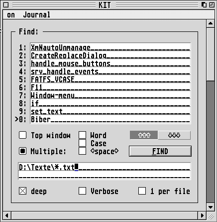 Dieser Suchpfad sucht im Verzeichnis PureC in Dateien mit der Endung *.C, *.H und *.S nach den gewünschten Suchbegriffen. Das Resultat wird in einem neuen Fenster mit Dateinamen, Zeilennummer und der Fundstelle präsentiert.