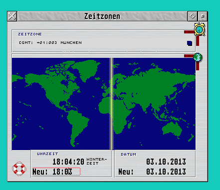 Nach dem Start öffnet Kalender zwei voneinander unabhängige GEM-Fenster: das Zeitzonen- und das eigentliche Kalenderfenster. Ins Auge fällt sofort das optisch sehr gelungene Zeitzonen-Fenster, in dessen Mittelpunkt eine Weltkarte steht, in der eine Zeitachse anzeigt, welche Zeitzone aktuell angezeigt wird. Eingestellt wird die Zeitzone über ein Aufklappmenü über der Kartengrafik. Für Deutschland muss der Eintrag "München" ausgewählt werden, die Hauptstadt Berlin sucht man allerdings vergeblich. Etwas verwirrend ist auch, dass die Orte nicht in ihrer alphabetischen Reihenfolge, sondern nach ihrer geografischen Lage auf dem Globus aufgelistet sind. Bei einer alphabetischen Ordnung würde man schneller fündig werden. Leider kann die Zeitzone bisher auch noch nicht mit einem gezielten Klick auf die Weltkarte ausgewählt werden.