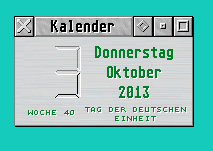 Im eigentlichen Kalenderfenster wird das Systemdatum in der gewohnten tabellarischen Form angezeigt. Unter der Tagesanzeige werden Monat und Jahr angezeigt, wobei mit der Maus durch die Jahre bzw. Monate geblättert werden kann. Für zukünftige Versionen wäre anzudenken, beide Werte auch mittels eines Aufklappmenüs anwählbar zu machen.