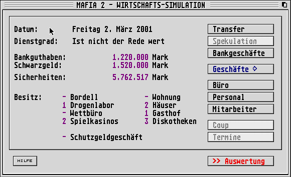 So, oder so Ă€hnlich könnte die Vorgeschichte von Mafia II lauten, einem Wirtschaftsspiel fĂŒr alle TOS-kompatiblen Computer, das vor einiger Zeit als Freeware freigegeben wurde. Zwar gibt es schon einen ganzen Stapel an Wirtschaftsspielen fĂŒr den Atari, aber diese sind meistens auf die niedrige bzw. hohe Auflösung fixiert. Mafia ist jedoch komplett in GEM eingebunden und schreckt auch nicht davor zurĂŒck, Schutzgelder von Doppelagenten (Emulatoren), Ă€lteren Herren (ST(E)s), höheren Zirkeln der Unterwelt (Hades) und dem Vogel des Jahres 2000 (lt. BUND: der Milan) zu erpressen).