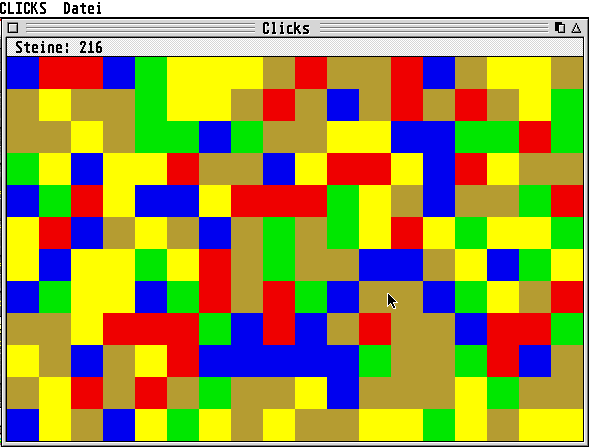 Clicks läuft sauber in einem GEM-Fenster und benötigt die Systemerweiterung WDIALOG. Das Spielfeld wirkt bunt, aber ziemlich nüchtern. Für die Zukunft könnten verschiedene Layouts Abwechslung schaffen, ebenso wie Animationen beim wegklicken.
