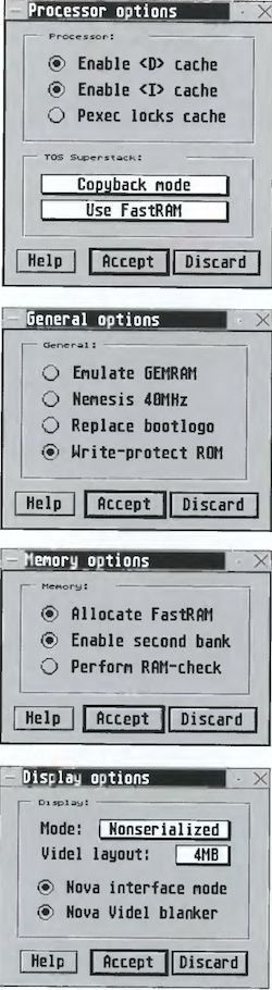 Nach dem Start öffnen sich 7 Fenster, deren Konfigurations-Optionen im folgenden beschrieben werden. Vorhanden sind auch Hinweise, welche Optionen am sinnvollsten sind (im Betrieb mit MagiC), dies kann sich aber individuell unterscheiden. Vor allem wichtig ist es FastRAM zu benutzen, da ansonsten von der Beschleunigung nicht viel bleibt. Die Empfehlungen und Beschreibungen beziehen sich auf Afterburner, die mit FastRAM ausgestattet sind (und wenn es nur ein 4 MB-Modul ist).