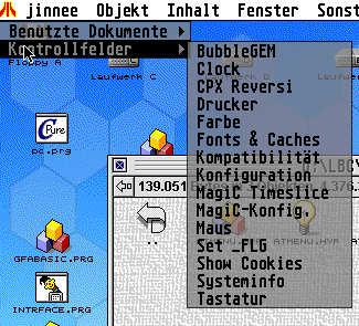 AtMenu kann über das Atari-Logo links oben erreicht werden. Mit der rechten Maustaste gelang man in den Konfigurationsdialog.