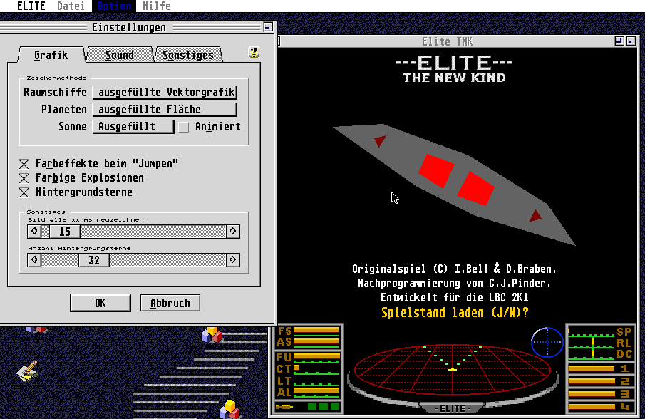 Elite TNK zeigt farbige, ausgefüllte Vektorgrafik im GEM-Fenster. Das sollte jeder gesehen haben - wenn er denn über einen schnellen Atari verfügt. Unter einem TT läuft nichts, aber immerhin kann eine FPU-Version installiert werden. Im Programm selber können die Grafikparameter verändert werden. Wer lieber klassisch mit nicht ausgefüllter Vektorgrafik spielen möchte, kann dies tun.