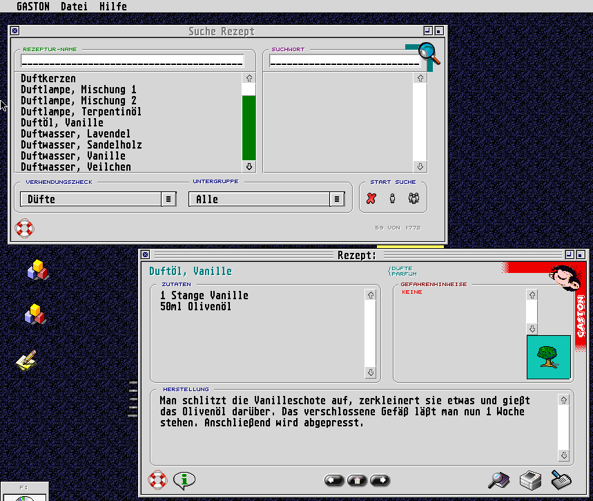 Gaston ist ein hervorragendes Programm, auch wenn erst nicht ganz klar war, von was dieses Programm nun die Portierung ist. Tatsächlich gibt es aber seit einiger Zeit das Programm „Hexenküche“ für Windows-PCs [1]. Ein Blick auf dessen Homepage lohnt sich auch für Atari-Anwender: Zutatenbilder können heruntergeladen werden.