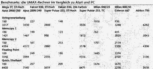 Man sieht also, dass sich je nach Arbeitsgebiet die erreichte Geschwindigkeitserhöhung relativiert. Festzuhalten bleibt aber, dass sich mit den Umax-Clones und MagicMac die derzeit in Bezug auf das Preis-/Leistungsverhältnis interessantesten Atari-Rechner realisieren lassen. Ein Hinweis zum Schluss: einigen aufmerksamen Beobachtern wird aufgefallen sein, dass der Super Pulsar 240 Mhz mit der Auflösung ST-Hoch weniger Leistung erbringt als ein Apus 200 Mhz in True Color. Dies ist kein Fehler oder eine Ungenauigkeit im Benchmark, vielmehr liegt es an den verbauten Grafikchips der Umax-Rechner. Die Super Pulsare verfügen über eine PCI-Grafikkarte, welche einige ST-Auflösungen nicht direkt beherrschen. Daher müssen diese umständlich nachgebildet werden, was erhebliche Systemzeit beansprucht. Der Umax Apus hat jedoch einen Grafikchip auf dem Mainboard, welcher ST-Hoch darstellen kann. Daher sind seine ermittelten Werte für alle Auflösungen gleich.