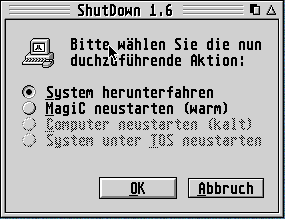 Eine andere wichtige Funktion erfüllt der Shutdown bei modernen Dateisystemen und virtuellem Speicher: es kann u.U. fatale Folgen haben, wenn vorher nicht alle Dateien korrekt geschlossen wurden. Nach Möglichkeit sollte daher unter MagiC und MiNT immer ein Shutdown ausgelöst werden, bevor der Computer ausgeschaltet wird. Neben den z.B. bei MagiC und N.AES mitgelieferten Shutdown-Programmen gibt es auch komfortablere Ersatz-Programme ([1][2][3]) wie "MagiC PC Shutdown" für die PC-Version von MagiC.
