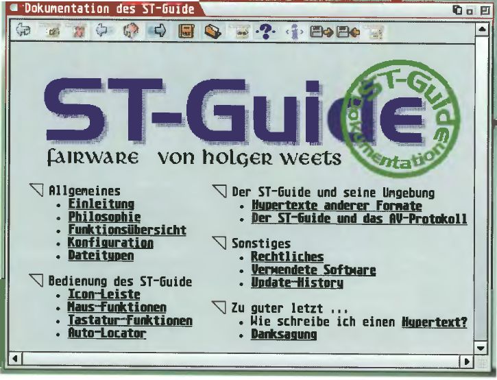 Lange, bevor HTML-Viewer den Anwender mittels Hyperlinks und Grafiken in die von ihm installierten Programme einführten, hatte sich auf dem Atari der ST-Guide als Online-Hilfesystem durchgesetzt. Und noch heute steht das Anzeigeprogramm bei Anwendern hoch im Kurs, die in erster Linie die schnellen Ladezeiten auch auf „kleinen" Original-Ataris und die systemtransparente Einbindung schätzen gelernt haben. Trotzdem nagt der Zahn der Zeit immer weiter am ST-Guide: Unter Auflösungen mit mehr als 256 Farben werden auch farbige Grafiken nur noch in Graustufen angezeigt, Dateinamen dürfen auch in Zeiten von MagiC und MiNT nicht mehr als die berüchtigten 8+3 Zeichen umfassen und allgemein wirkte die optische Aufmachung etwas veraltet.