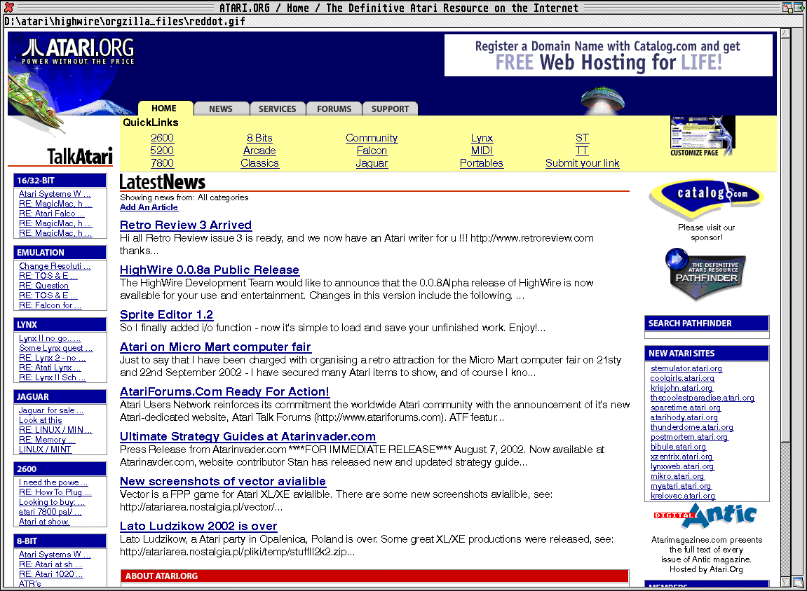 Fast wöchentlich erscheinen neue Webseiten, die sich mit dem Thema Atari beschäftigen. Besonders beliebt sind hier natürlich regelmäßige Nachrichtendienste. Leider hatte die deutsche Atari-Internet-Gemeinde hier im Sommer einen schmerzlichen Abgang zu verkraften: Die atos, lange Jahre ein Vorzeigeobjekt freiwilligen Atari-Enthusiasmus strich im Juli offiziell die Segel. Was das ehemaligen Disk-Magazin einst stark machte, fehlte nun nämlich: die Motivation.