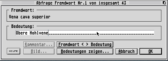 Nach dem Laden kann mit Bearbeiten/Test starten mit der Abfrage begonnen werden. Die Abfrage erfolgt ohne Zeitdruck und wird mit „Abbruch“ beendet. Die Dialogbox dazu kann komplett per Tastatur bedient werden und zeigt jederzeit die Anzahl der richtigen und falschen Antworten an. Schummeln läßt sich nur bei der Fremdwortabfrage, bei der sich Bedeutung und Fremdwort vertauschen lassen.