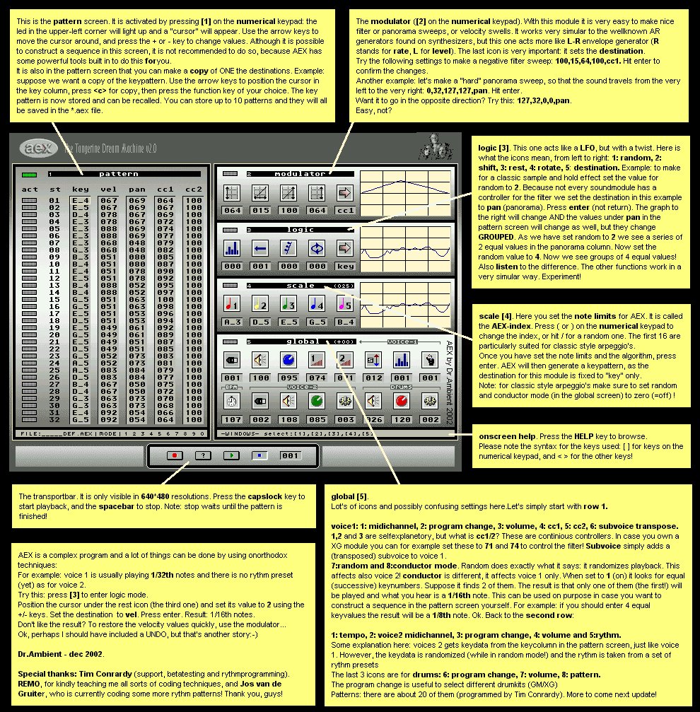 AEX wird nach wie vor nur mit einem englischsprachigen Hilfetext ausgeliefert. Wer sich nicht durch das gesamte Dokument arbeiten möchte, der kann von der Webseite des Entwicklers [1 ] auch eine GIF-Grafik laden, die die Bedienung von AEX auf einen Blick darstellt. Einmal ausgedruckt und neben den Atari gelegt, hat der Anwender alle Funktionen stets vor Augen. Hinzu kommt eine Einweisung auf der Webseite von MIDI-Guru Tim Conrardy [2],