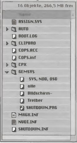 Verschieben Sie nun das „Shutdown.PRG" vom Schreibtisch in den Ordner GEMSYS. Schließen Sie den Ordner „GEMSYS" und löschen Sie im Ordner „MAGICC" alle Dateien, die Sie nicht im Bild rechts sehen. Einfach ausgedrückt: Bild rechts zeigt alle für die Installation notwendigen Dateien - es sind jedoch deutlich mehr Bildschirmtreiber vorhanden als dargestellt!