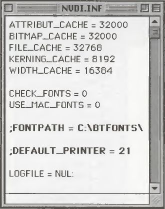 Falls vorhanden: Editieren Sie die Datei „NVDI.INF" wie im Bild links. Wenn Sie Simpletext benutzen, machen Sie sich die Mühe, die vorangestellten Zeilenumbruch-Zeichen (Quadrat| zu löschen. Wichtig ist, die hier fett gedruckten Zeilen mit einem Semikolon zu entwerten. Dies steigert die Betriebssicherheit des NVDI, denn es soll künftig ausschließlich den Bildschirmaufbau beschleunigen. Die Font- und Druckoptionen werden von Calamus selbst ausgeführt.