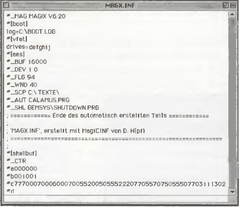 Editieren Sie die Datei „Magx.INF" wie im Bild rechts. Wenn Sie Simpletext benutzen, machen Sie sich die Mühe, die vorangestellten Zeilenumbruchzeichen (Quadrat) zu löschen. Tragen Sie unter „drives" gar nichts oder alle Ihnen bekannten Laufwerke ein, mit Ausnahme des Bootlaufwerks - dies ist später für eine sichere Platzierung der Datei „SCRAP.TXT" nötig. Löschen Sie alle Einträge „#_ENV", sie führen zu Abstürzen beim Sichern der Calamus-Einstellungen unter Mac OS 8.6. Verzichten Sie notfalls auch auf das „Boxkite.PRG" und legen Sie „TOSFIX.PRG" in den AUTO-Ordner.