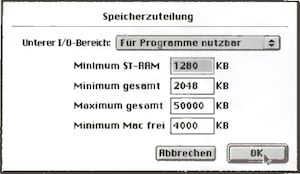 Starten Sie Calamus. Halten Sie dazu die [Alt]-Taste auf der linken Seite der Tastatur gedrückt und doppelklicken Sie die Datei „MagicMac Prefs" oder deren Alias. Es öffnet sich die Dialogbox für die Speichereinstellung. Stellen Sie für das ST-Ram mehr als 1024 KBytes bereit. Der Eintrag „Minimum gesamt" kann den gleichen Wert haben. Es wird sogar empfohlen, die ersten drei Werte völlig identisch bei zum Beispiel der Hälfte des verfügbaren RAM-Speichers einzustellen. Je nach verwendetem Drucker sollten Sie zwischen 4000 und 12.000 KBytes unter „Mac frei" einstellen.