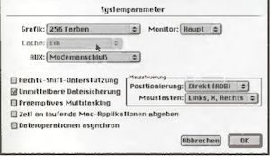 Klicken Sie auf „OK". Es erscheint das Systemparameter-Fenster. Wenn Sie QuickDraw, Speed-Doubler und NVDI installiert haben, können Sie ohne Geschwindigkeitsverluste den TrueColor-Modus wählen. Verwenden Sie nur den Schalter „unmittelbare Dateisicherung". Der (Mac-| Drucker beginnt mit der Arbeit erst, wenn alle Seiten übergeben wurden (das geht ratzfatz) und Sie mit [Command]-[W] auf den Finder umschalten. Wenn Sie eine USB-(optische) Maus installiert haben, wählen Sie die Einstellung wie oben links (relativ, immer links).